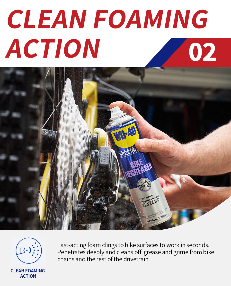 Fast-acting foam clings to surfaces to work in seconds. Safe for bike finishes and components with no citrus solvents or acids. Easy to use, precision spray drives cleaning agents into chain links.